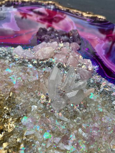 Crystals: Clear Quartz Points from Brazil, raw Rose Quartz and Amethyst also from Brazil